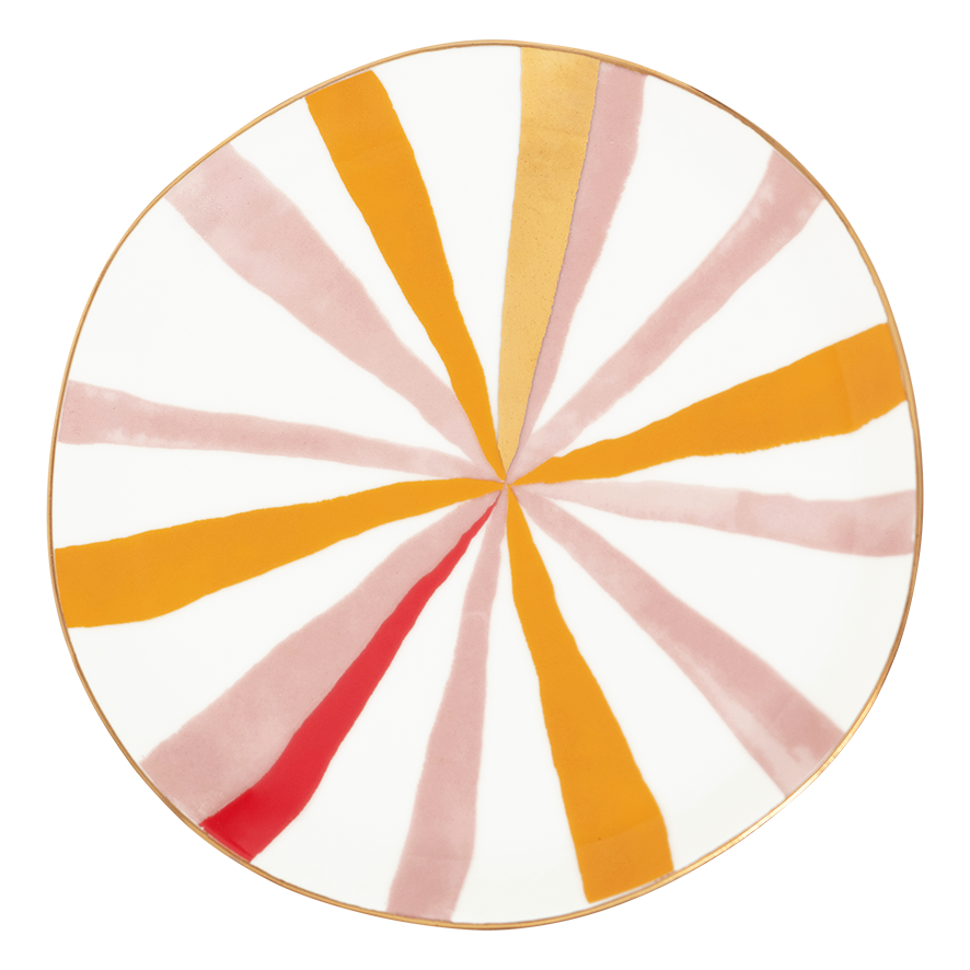 Joyful C brengt een keramisch bord met handgeschilderde, zachte kleuren in zonnestralen van roze, oranje, goud en felrood, wat een inspirerend accent toevoegt aan elk interieur. Tafelscaping is nog nooit zo eenvoudig geweest. Onderhoudsinstructies: alleen met de hand wassen - om de gouden voering te beschermen.