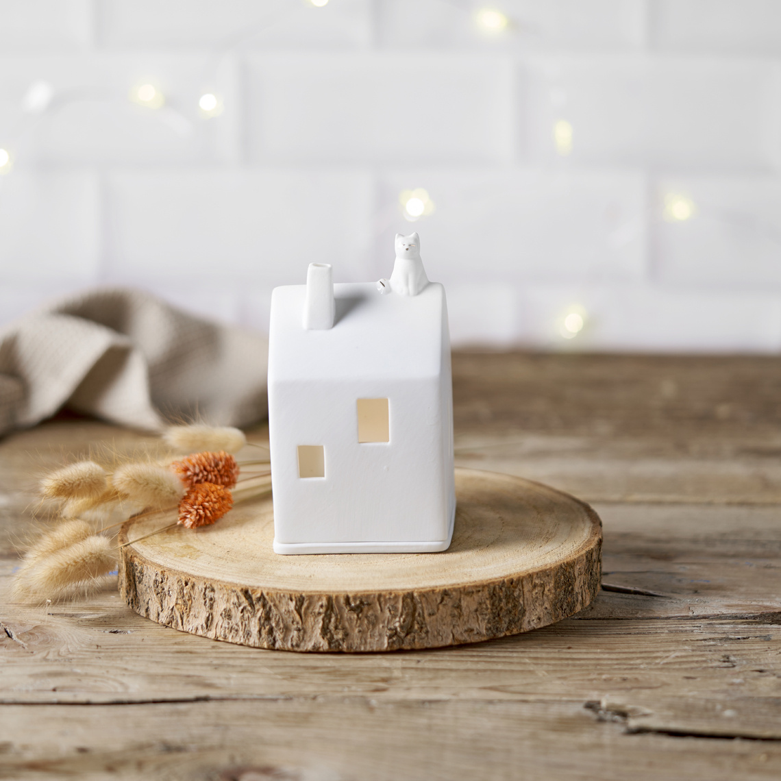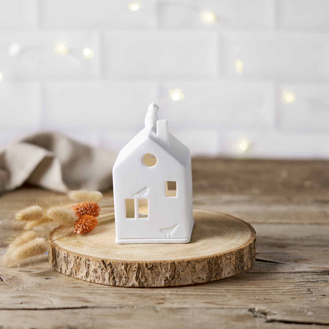 Dit witte porseleinen huis zorgt voor een gezellige sfeer in jouw huis. Met een theelichtje binnenin geeft het zacht licht en warmte. Het huis is gemaakt van ongeglazuurd porselein.