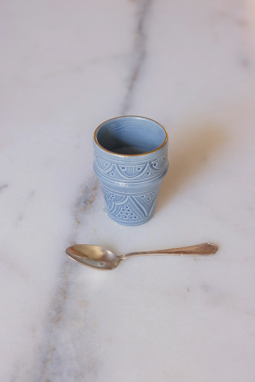 Geniet waar je ook bent van je koffie of thee, in deze medium medium cup beldi blue stone witgouden elegante cup, geïnspireerd op de Marokkaanse traditie. Een verfijnde break voor een intense espresso of een delicate koffie.