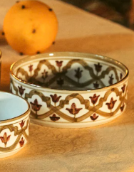 Handgemaakt: Elk stuk wordt zorgvuldig met de hand vervaardigd via een tiental essentiële stappen, waaronder gieten, patroonschilderen, emailleren en drie keer bakken, waarvan de laatste de schittering van echt goud onthult. Dit langdurige proces kan tot 10 dagen duren. Deze toewijding aan detail zorgt voor uitzonderlijke kwaliteit en benadrukt tegelijkertijd traditioneel Marokkaans vakmanschap.
