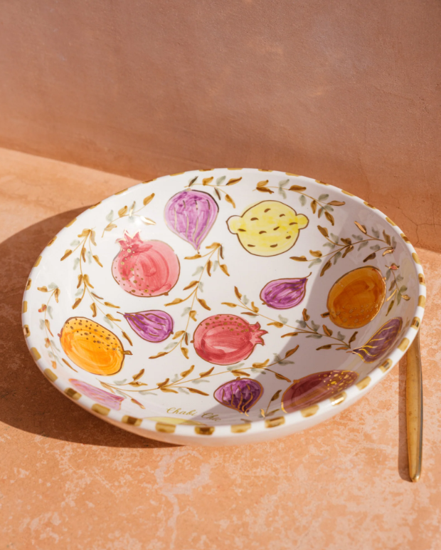 Voeg een vleugje verfijning toe aan uw maaltijden met onze Tutti Frutti Low Salad Bowl. Ideaal voor het serveren van salades, pastagerechten of als decoratief element met vers fruit, deze slakom belichaamt elegantie en functionaliteit. Het delicate, handgemaakte ontwerp brengt charme aan uw tafel, of het nu voor een informeel diner of een speciale gelegenheid is. Elk stuk is versierd met een opvallende binnencirkel van 12-karaats goud, een echte Chabi-Chic-signatuur.